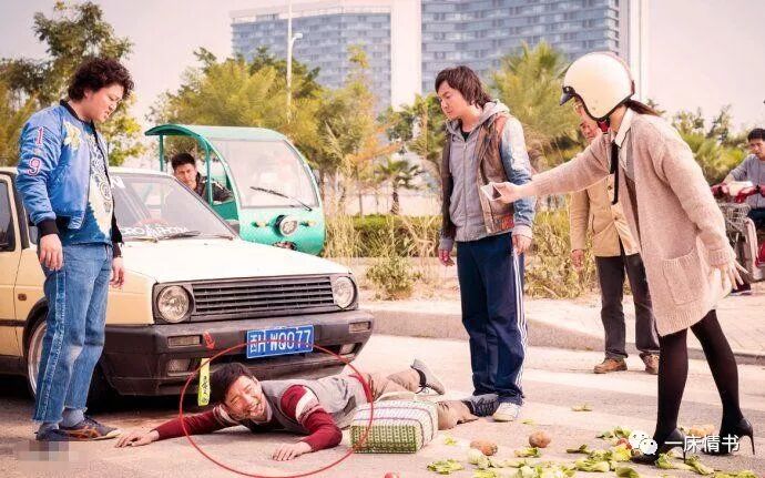 碰瓷大叔一共出镜两次,第一次是王多鱼和庄强在红绿灯路口停车的时候,他提着菜篮子故意走到路中间,然后将篮子里的菜往空中一撒,夸张的倒在车前,声称自己被撞了。