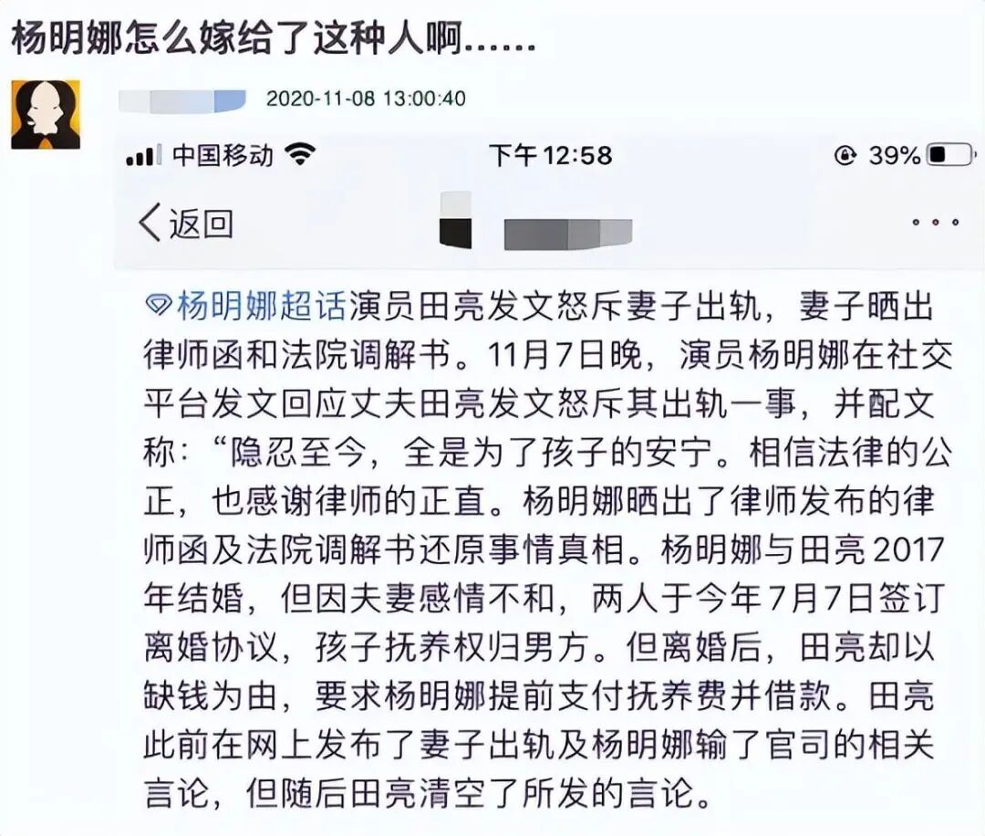然而,对于前夫的诽谤,杨明娜毫不犹豫地通过法律途径将他告上法庭,令人惊讶的是,田亮迅速收起矛头,立刻删除所有相关信息。