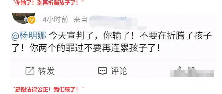 他对杨明娜进行了无休止的诽谤,诬陷她有外遇,甚至是同性恋。他还大言不惭地说法院都支持他,才给他孩子的抚养权。