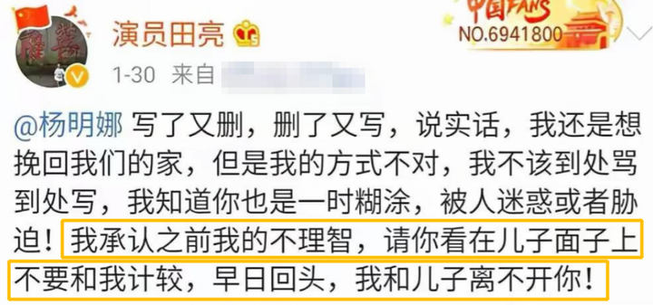 他的每个字眼都在含蓄地指责杨明娜无视家庭和不贞,每个字都在声明他自己是受害者。由于“田亮”和“出轨”这两个词,引来了众多的目光。