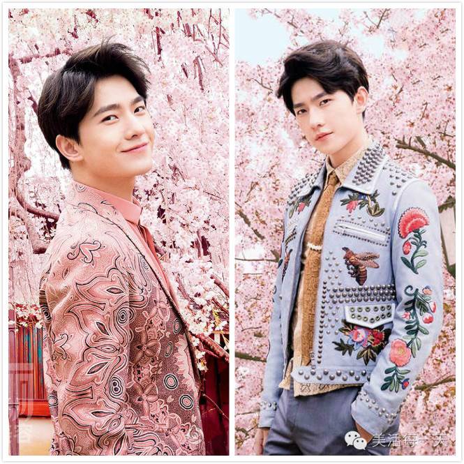 左图中杨洋身穿同色系的西装与衬衫,西装的纹样华丽复杂,以及西装的青果领设计,都将西装的正装风格减弱,进而转化为休闲西装。
