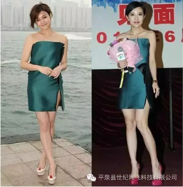 陈妍希和郭采洁都穿了这件深绿色高开叉礼服。身材略胖的陈妍希穿起来身体没有曲线,郭采洁身材纤瘦,驾驭住了这件衣服。
