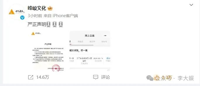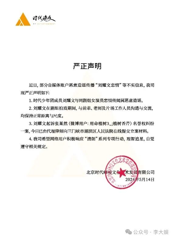 通过公司发布的声明可以看到,其明确提及有关刘耀文与女演员的恋情一事是恶意造谣,并且强调刘耀文在拍摄《第二十条》时与对手演员保持着正常距离与尺度,最后还贴出了起诉造谣者的立案材料。回应不仅条理清晰,还有理有据,态度强硬且坚决。