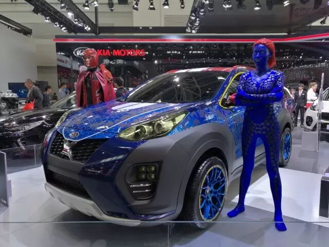 在起亚展台,两位礼仪COSPLAY起电影《X战警》中的形象。