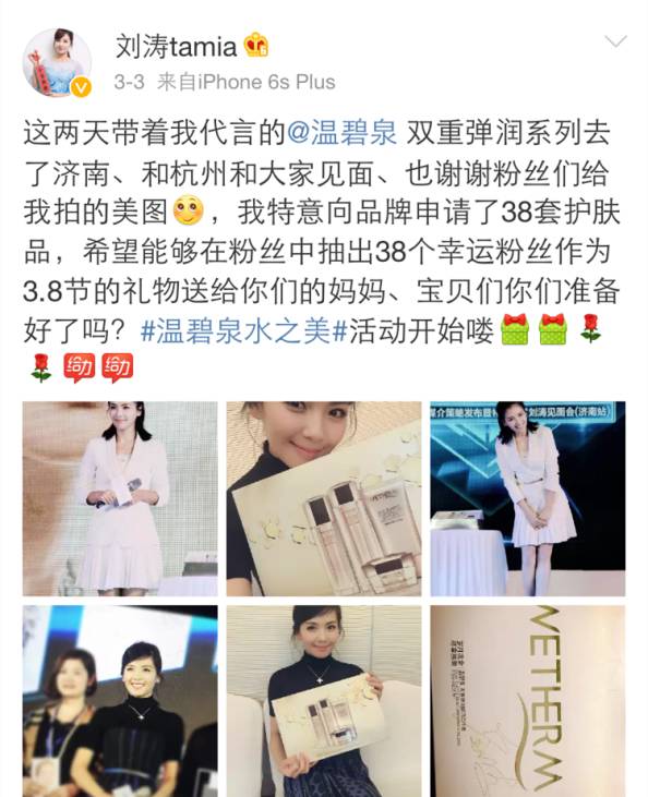 于身边的人而言,刘涛犹如小叮当,总是随手变出各种贴心又实用的小物件和零食。面对粉丝,刘涛又变身霸道总裁,总是用礼物砸我们一脸。这不,今年三八女神节,总攻大人主动跟温碧泉品牌方申请了38套价值592元的温碧泉双重弹润赋活系列产品,送给粉丝。
