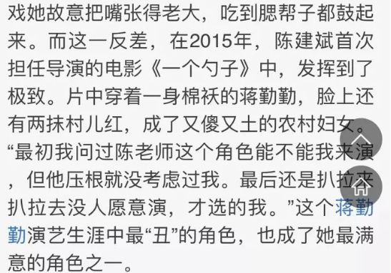 电影《一个勺子》里本来陈建斌并没有考虑过选她,因为扮相太丑没人演,于是蒋勤勤欣然接受,扮成又傻又土的村妇造型。