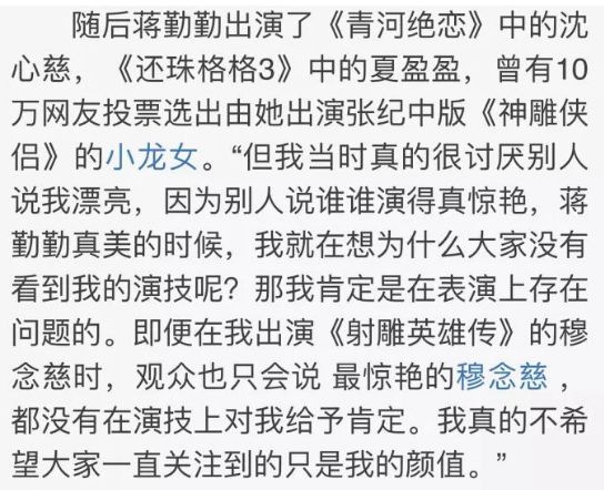 蒋勤勤采访曾说她真的很讨厌别人夸她漂亮,张纪中版的《神雕侠侣》,曾有10万网友选她出演小龙女,结果蒋勤勤很愤怒,表示大家看到我总是说我美,根本不会注意到自己的演技,很不希望大家一直把关注点仅仅放在她的颜值上。