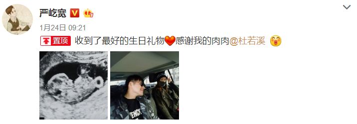 严屹宽前天生日,老婆杜若溪怀孕,双喜临门,他本人也很兴奋的在微博上公布了喜讯,并且公布了宝宝的b超照。