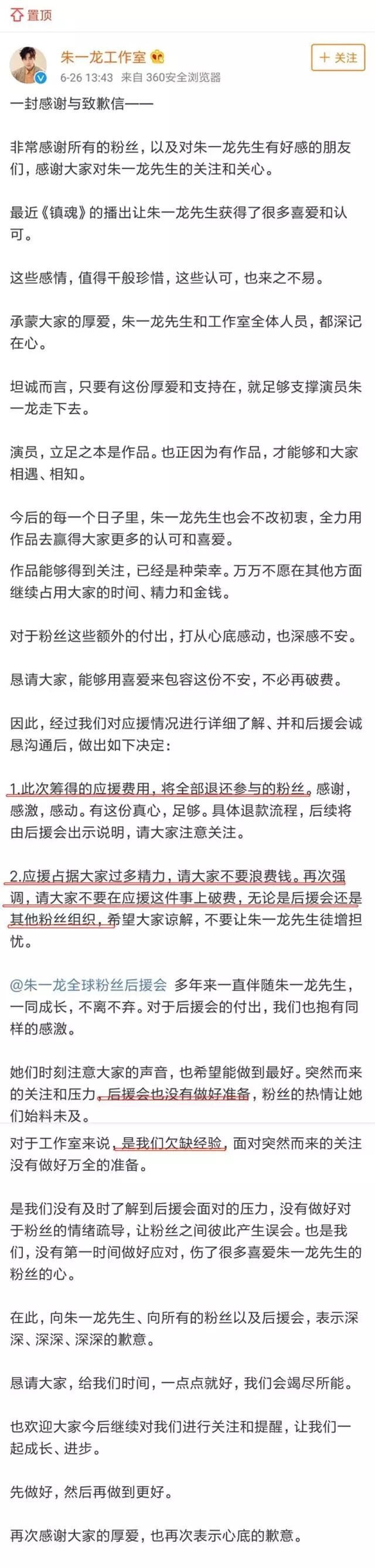 这篇声明还是很诚恳的,有为工作室和后援会挽回一点形象。