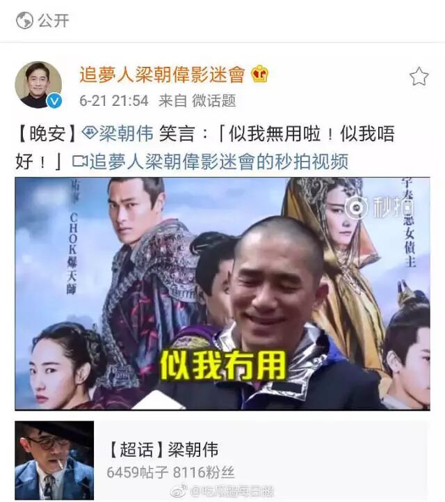 梁朝伟影迷会官博还特意发了影帝的动图,“像我没用啦,像我不好!”,哈哈哈哈哈哈!