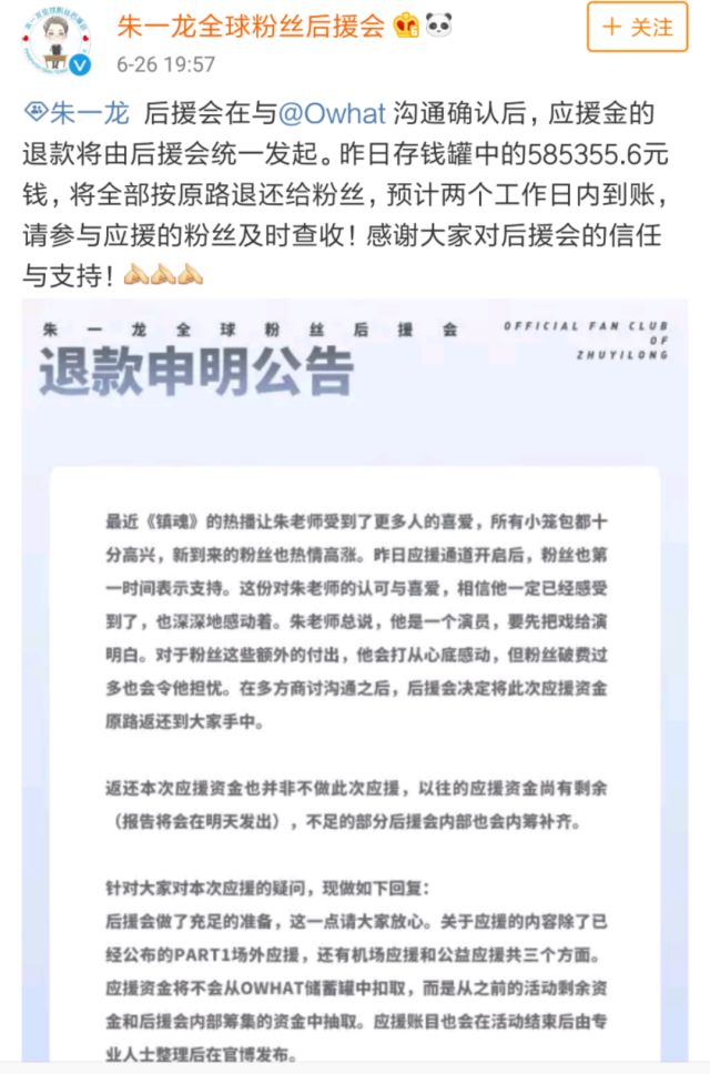 1. 应援的钱会全部退还给粉丝。