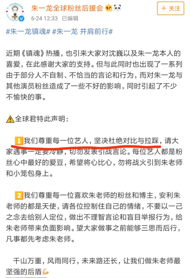 对此,朱一龙的后援会也有采取行动,置顶微博就有提到禁止对比和拉踩别家艺人↓