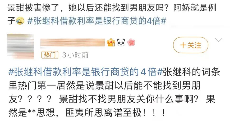 今早,#张继科借款利率是银行商贷的4倍#的词条下面,热门第一的竟然是“景甜还能找到男朋友吗”。真的很无语。这些人配得上四个字:管好你自己——作为严肃的写作者不好直接暴粗口,只好多写了一个字。
