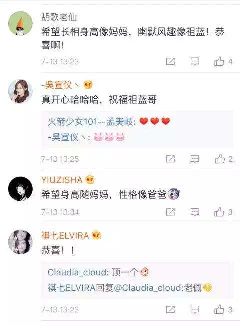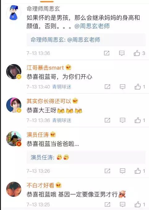 不少网友还调侃:希望长相身高像妈妈,幽默风趣像祖蓝!
