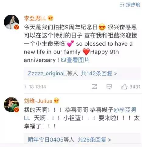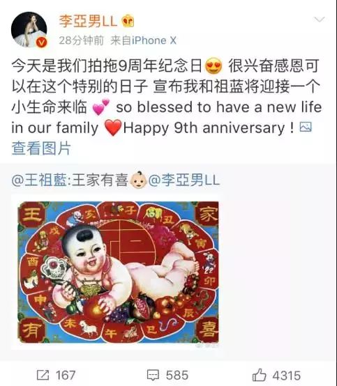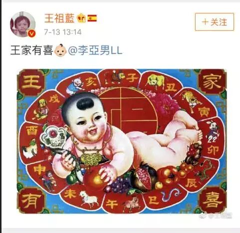 王祖蓝发文宣布“王家有喜”。也就是说他的妻子李亚男怀孕了!!