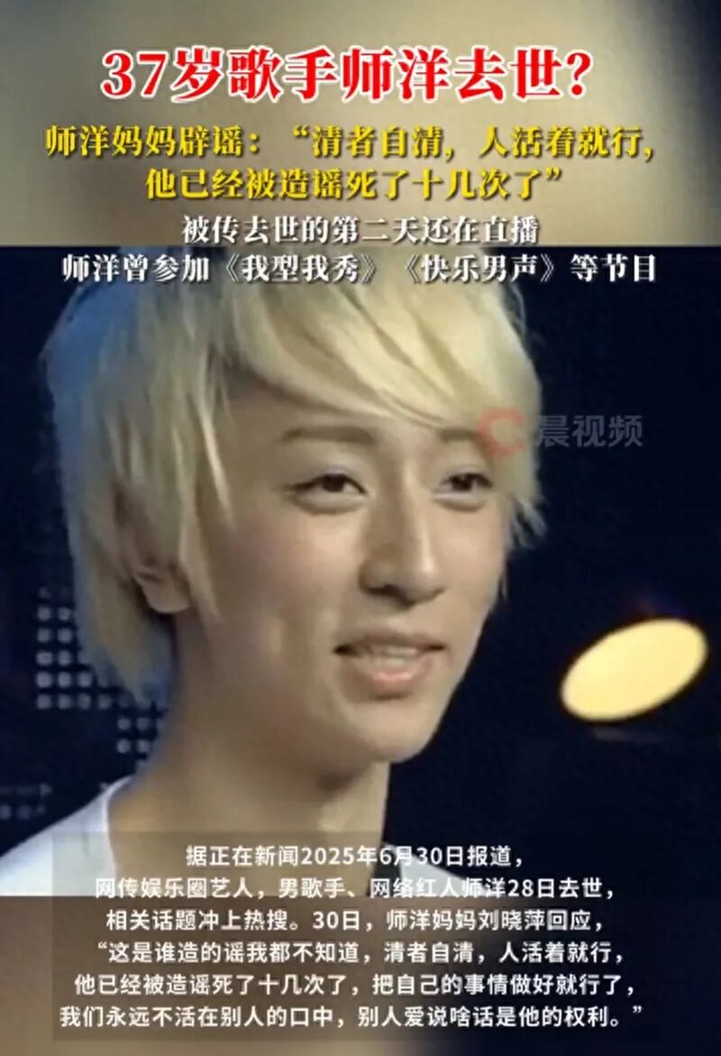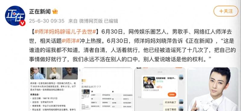 6月30日,一则"师洋去世"的消息在网络上快速传播,话题迅速冲上热搜。