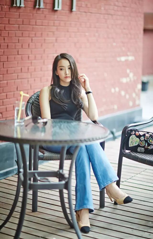 牛仔喇叭长裤+黑色露肩背心+双色鞋