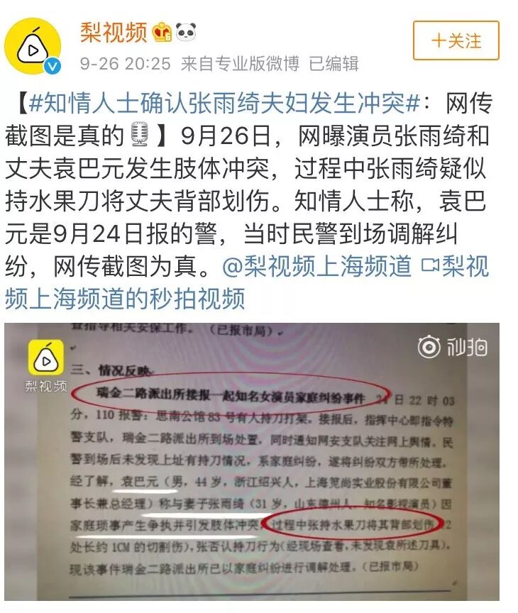 有人爆料:因为和丈夫袁巴元产生家事纠纷,两人互殴,暴脾气的张雨绮拿起水果刀在袁巴元背上留下了一道大约一厘米的伤口。