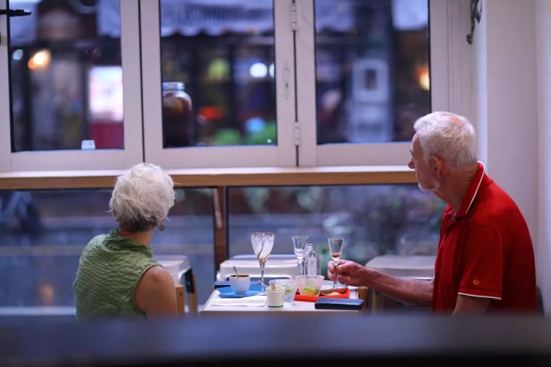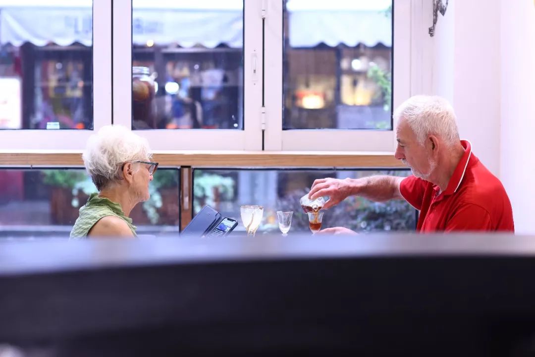 老两口刚进店门,天公便下起暴雨,Ian和Susan倒也不慌不忙,坐在窗口点一杯茶,一份冰tea凌,望着窗外的哗哗的大雨和路上行色匆匆的路人,看看手机,聊聊天,悠哉悠哉。