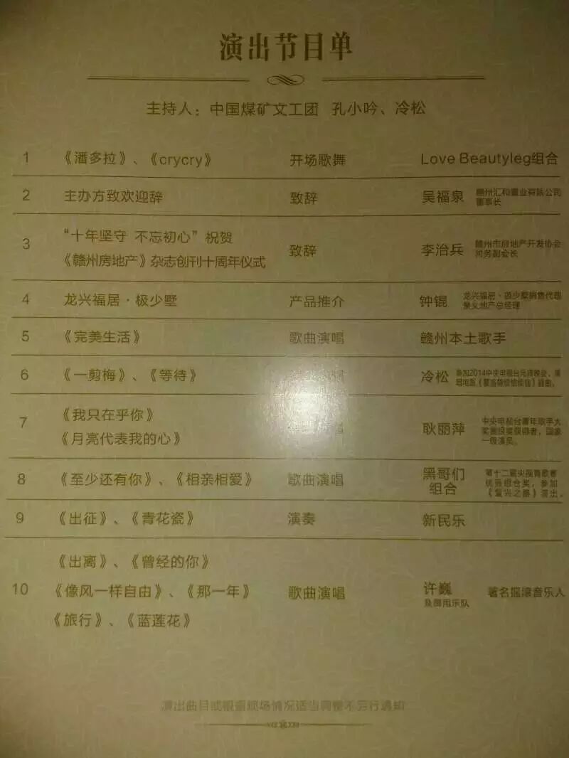 其实此次晚会是由极少墅独家冠名,赣州市音乐家协会、赣州汇和置业有限公司主办,赣州房地产杂志社策划推广的一个音乐节晚会。晚会上许巍是作为最后一个上台演唱的歌手,压轴出场,并不是他的专场演唱会,晚会上还呈现了很多精彩的其他节目哦,喏,节目单为证。