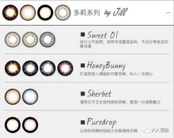 分好几个系列,除了HONEY系列都挺喜欢的,因为HONEY带着比较假,大人是属于眼白比较多的,所以戴上之后就会有一种乡村非主流的感觉。