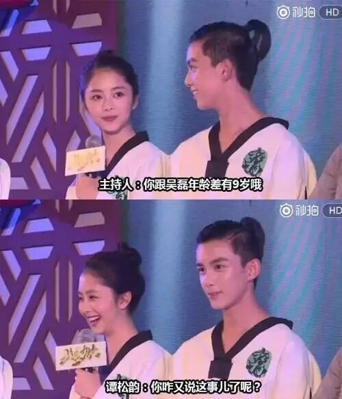 看出谭松韵的尴尬后,吴磊立马接上:“对,相差9岁,我15岁,她6岁,所以我更应该好好照顾她。”(当时吴磊15岁)