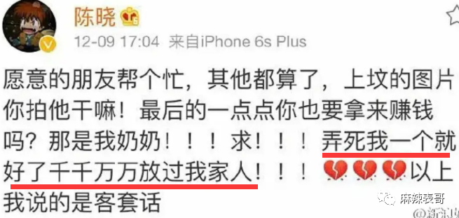 被曝光后,陈晓:弄死我一个就好了,放过我家人。以上说的是客套话。