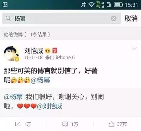 而两人的互动更是少得可怜,15年,也就是两人新婚不久,应该还是如胶似漆的时候。在杨幂的主页上搜索刘恺威,相关的微博,主要就是生日祝福,帮老公刘恺威和闺蜜唐嫣宣传新戏……