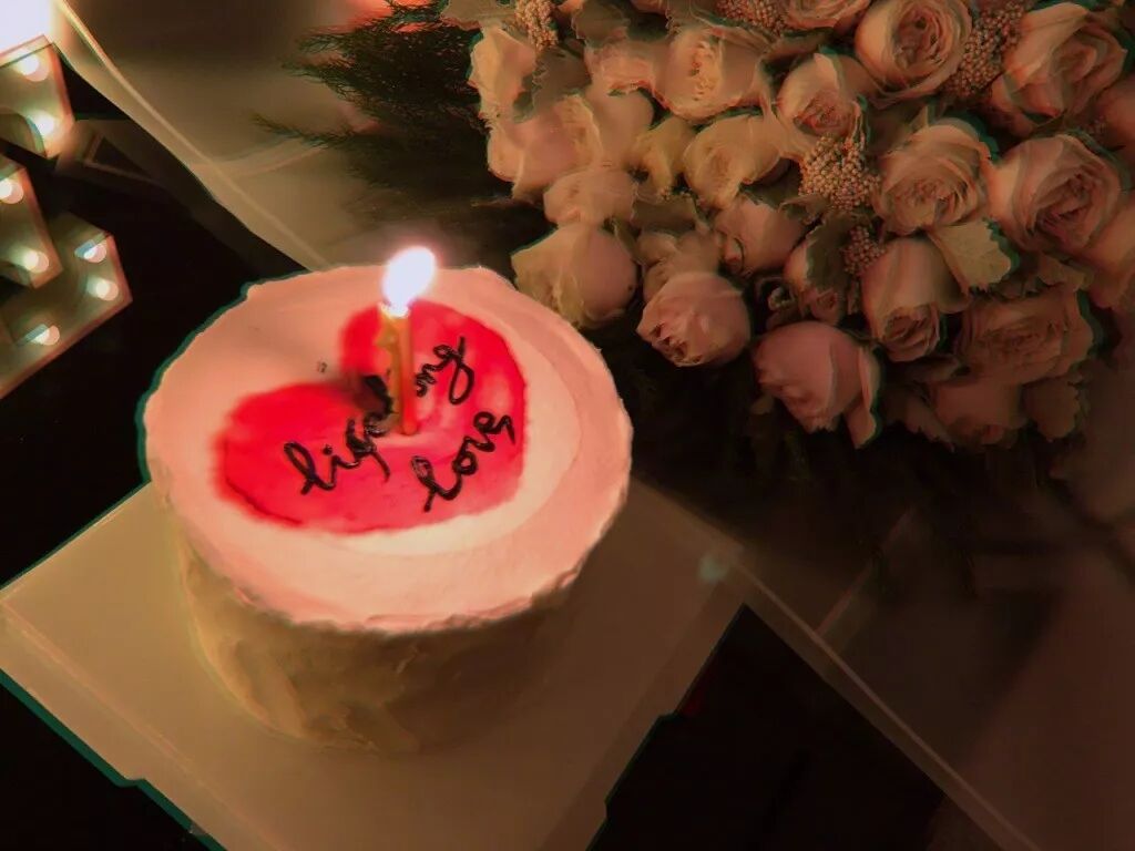 再瞅瞅照片中背景房间内的布置,花瓣气球、玫瑰蜡烛,墙上那个赤裸裸的“love”,以及蛋糕旁的Vivian灯牌。讲真,说是求婚现场估计都有人信呢!