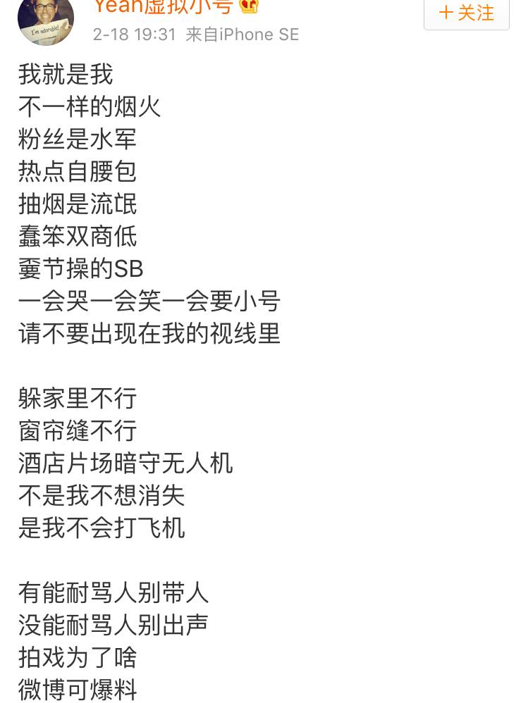 抽烟事件第二天,随着郑爽爸爸微博的一条@,郑爽的小号“yeah虚拟小号”伴随着粗口出现在大众视野中。