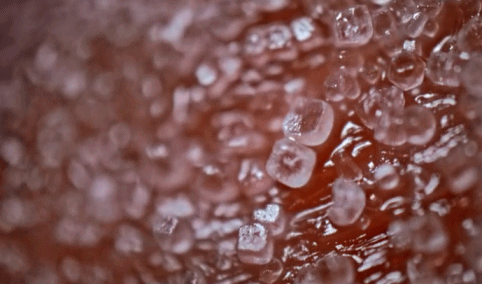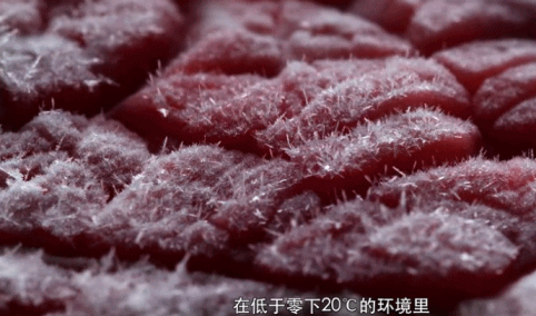 在超微观摄影下,人们可以看见在低于零下20度的环境里,急速冻结的马肉上盛开的冰花。