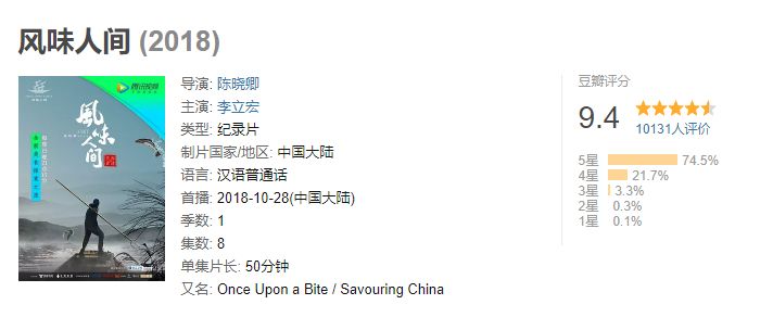 这部来自《舌尖上的中国》第1、2季导演陈晓卿与其团队推出的新作《风味人间》,仅播出一集就收获了豆瓣9.4的超高评分,甚至超过了《舌尖1》。