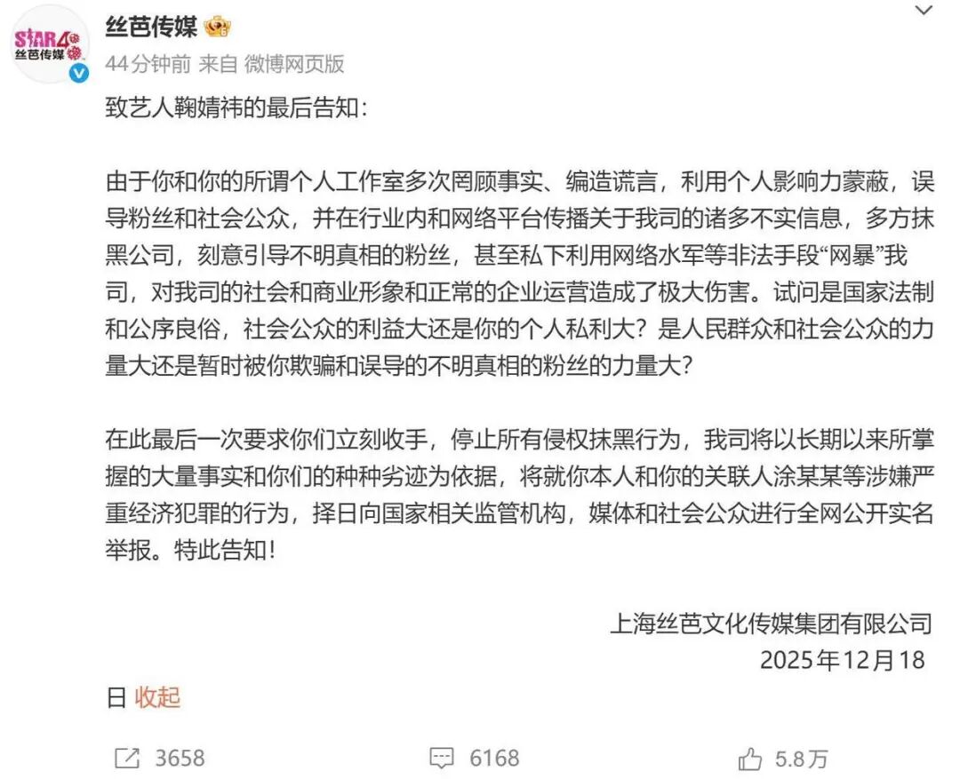 后续公司发文回应称曾艳芬是“平白无故仅凭道听途说污蔑团里所有成员的清白,恶意放大抹黑过去的同伴”,表示所有不实言论已报警、已委托律师取证、提告。紧接着,公司再次发出一则“致艺人鞠婧祎的最后告知”内容,其中要求鞠婧祎一方立刻收手,停止所有侵权抹黑行为,强调公司掌握了鞠婧祎本人和她关联人涉嫌严重经济犯罪的行为。要是还不行动,公司择日将向国家相关监管机构,媒体和社会公众进行全网公开实名举报。