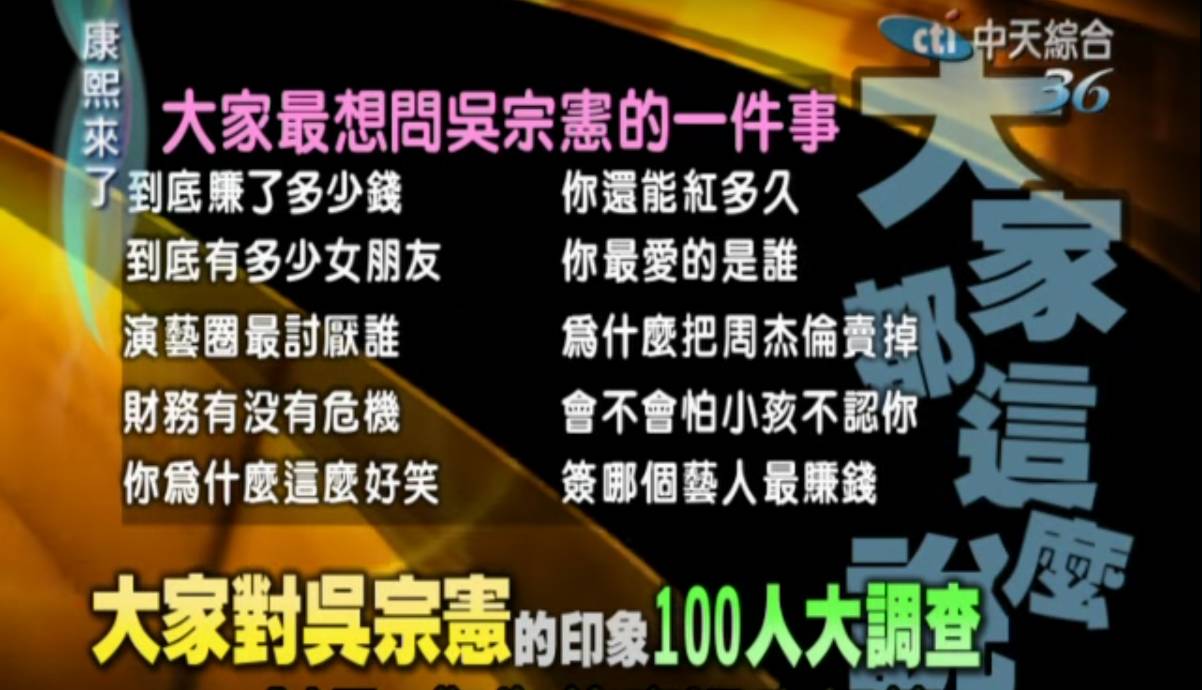 这是2004年,吴宗宪上《康熙来了》之前,节目组面向100个人征集的“大家最想问吴宗宪的一件事”。