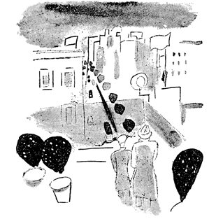 另一幅让宫崎骏印象深刻的插画,源自书中另一个重要的场景。一个雨天,十四岁的本田润一和舅舅在东京繁华街区的百货楼顶,看着人来人往,心中突然产生前所未有的变化——有许多人在他看不见的地方生活着,人类就像茫茫大海中的水分子,他只是其中之一。因为没有自我为中心思考问题,舅舅开始叫他“小哥白尼。”