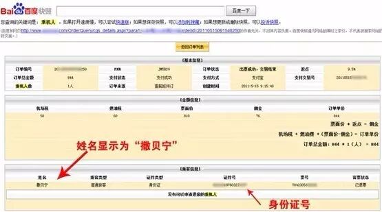 搜到了撒贝宁机票订单的页面