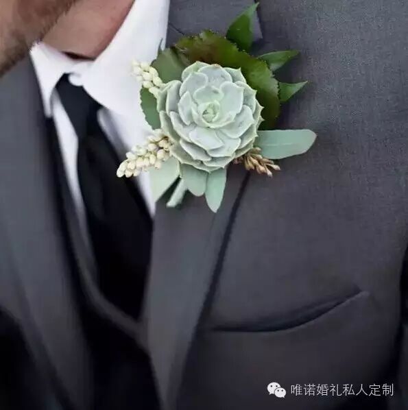 胸花毕竟只是新郎帅气的点缀而已,别弄的太华丽太高调,喧宾夺主,胸花的花梗也要细细短短一截,太笨重真心不好看。