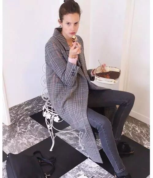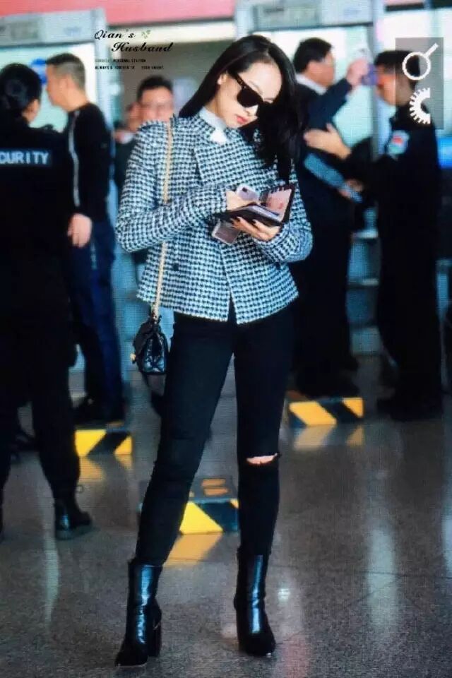 前脚刚粉嫩少女完了,而水晶的另一套帅气复古风了,灰色细格纹外套+黑色衬衫+紧身裤,优雅英伦风格~黑色皮靴加持很加分。