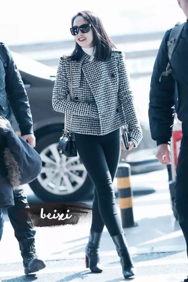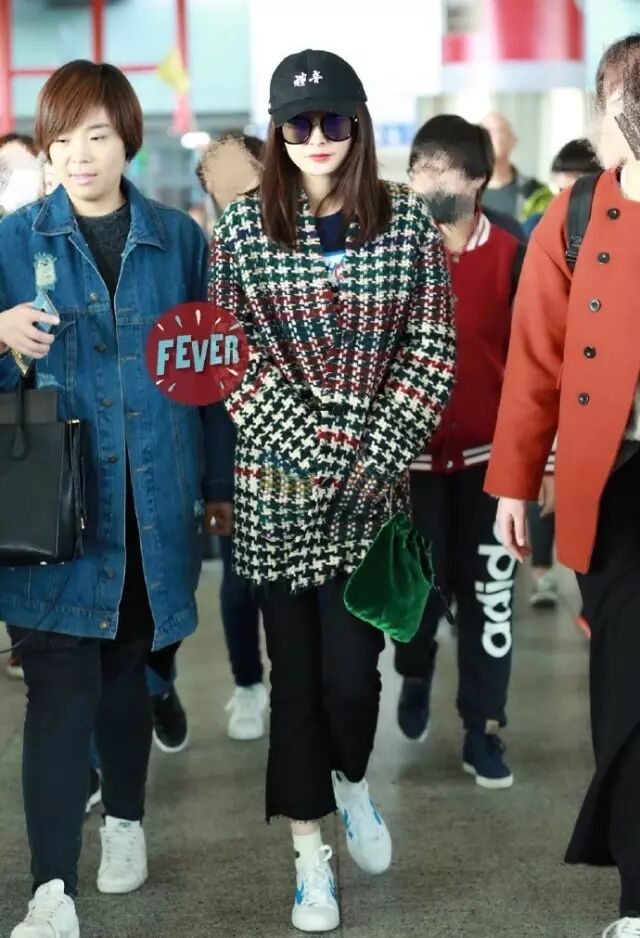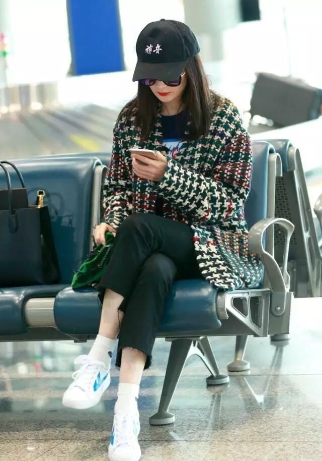 这件彩色编织千鸟格外套,搭配九分喇叭裤和回力小白鞋,显示出杨幂的衣Q很强劲!