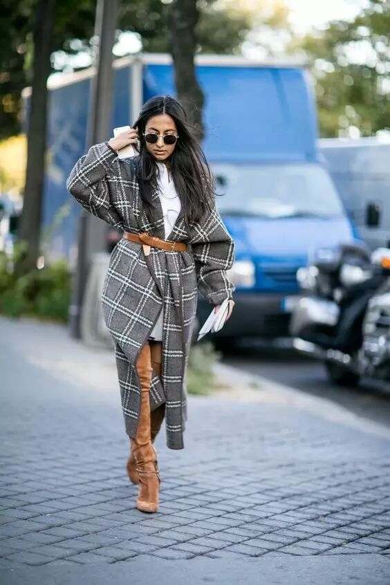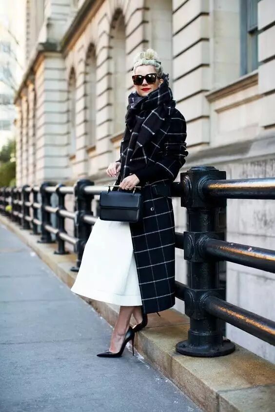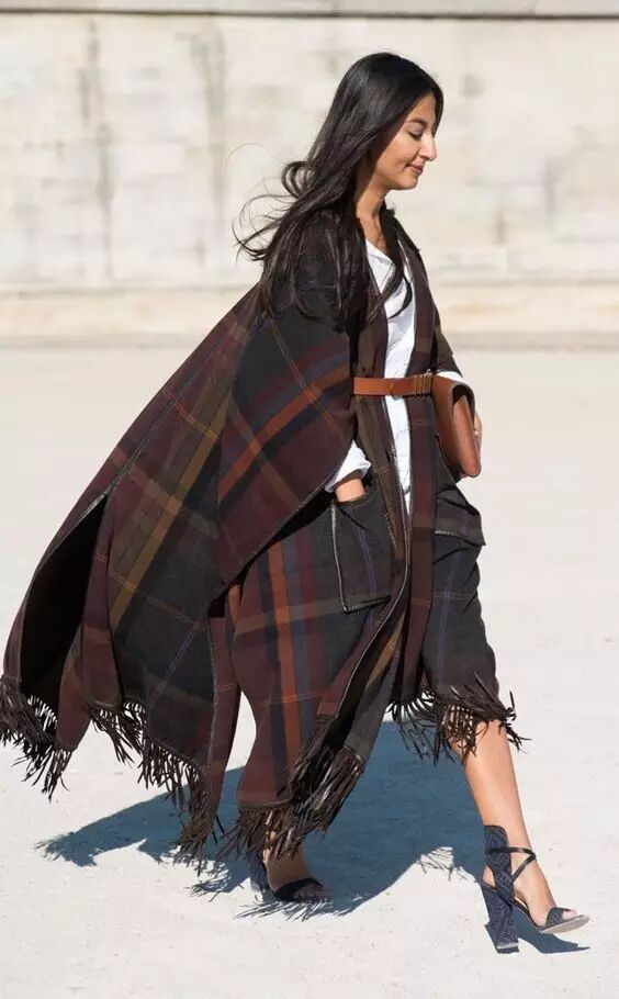 也可以直接拿超大款的格子围巾当成外套~搭配一条皮带明确腰线~