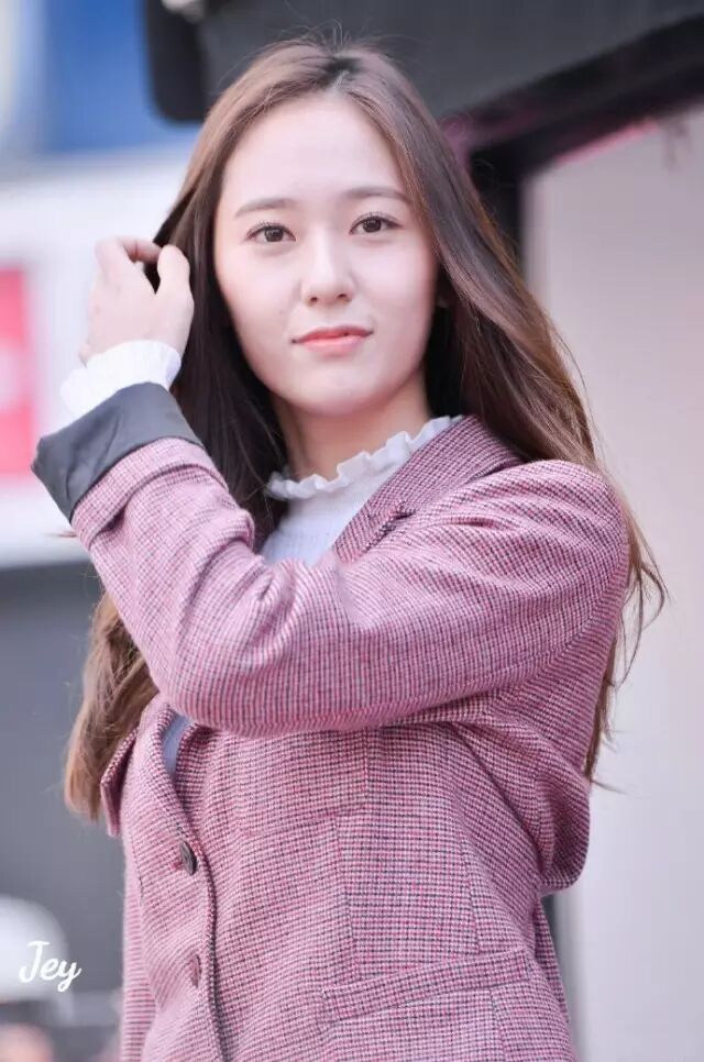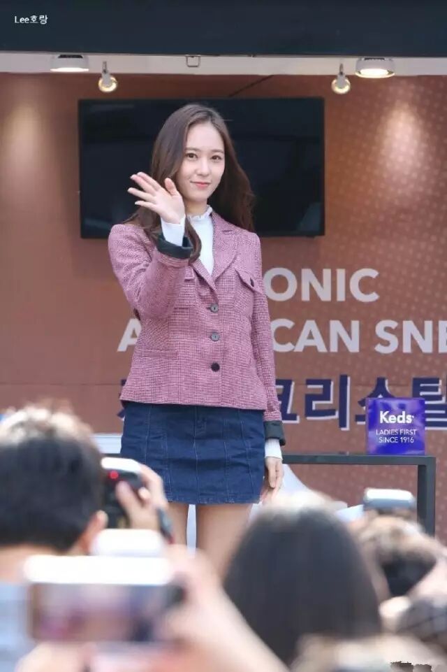 Krystal这件粉色格子外套少女心爆棚,搭配白色木耳边高领衫+牛仔短裙,活脱脱一个高中美少女~