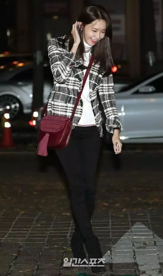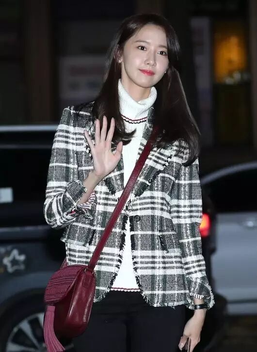 允儿的这套LOOK和宋茜的搭配有点类似,不过允儿选择的是西装外套版型,格纹比较宽大,看起来更学院风的文艺感~