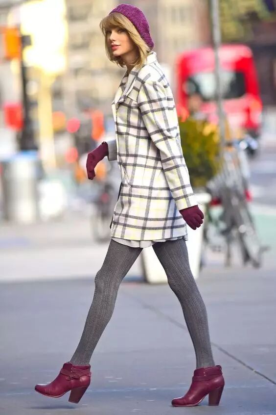 霉霉喜欢用格纹外套搭配短裙和短靴,看起来有浓浓的复古学院风格~