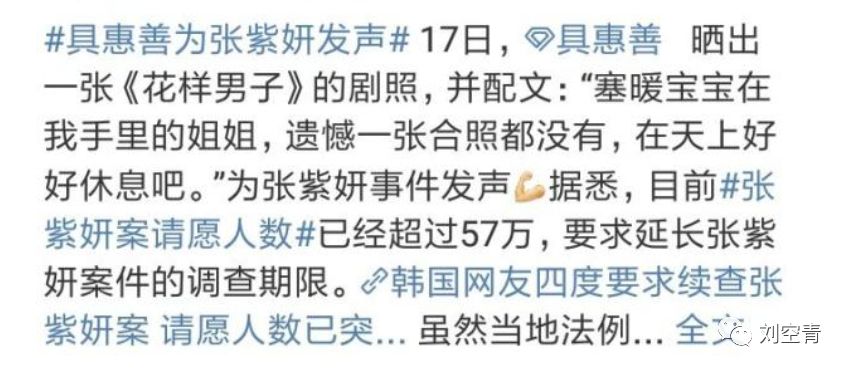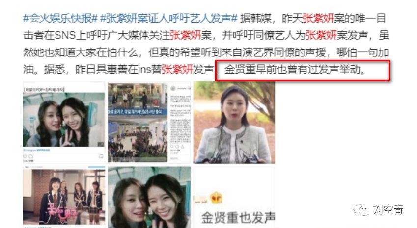 在张紫妍最近重启调查的事件中,南韩开始有明星站出来发声了。