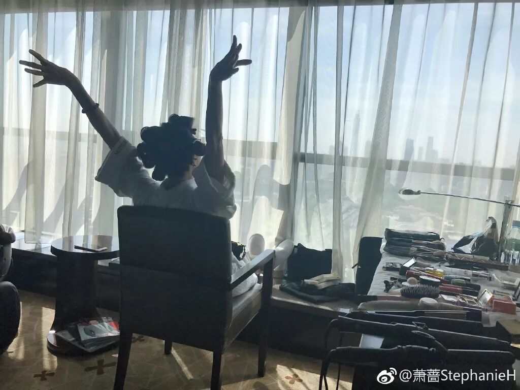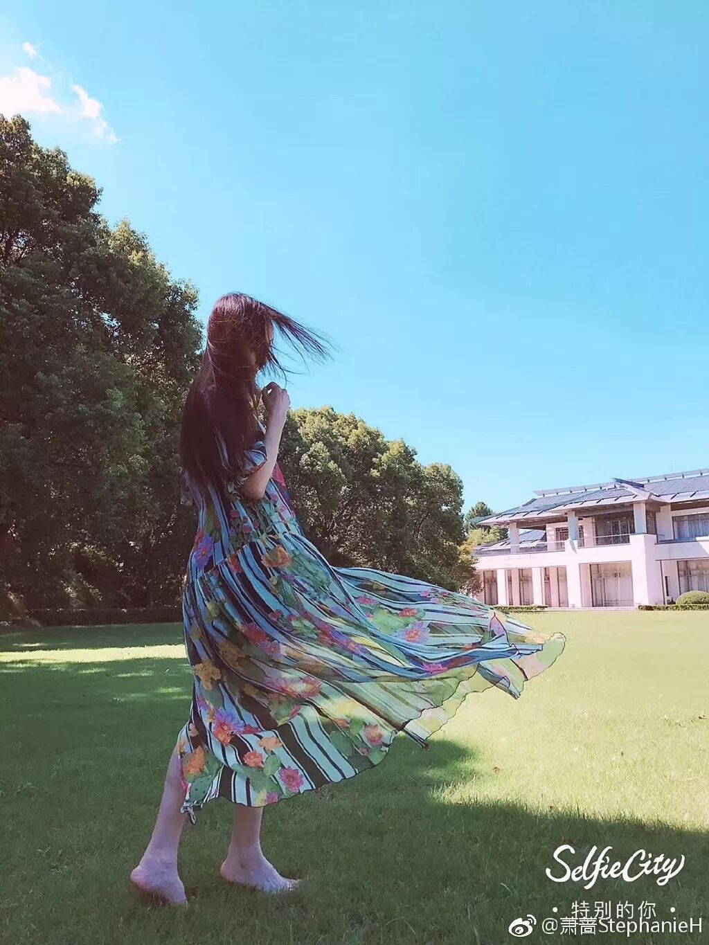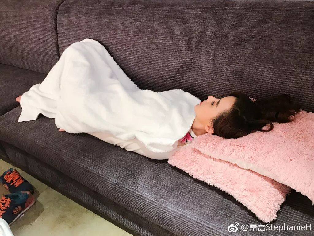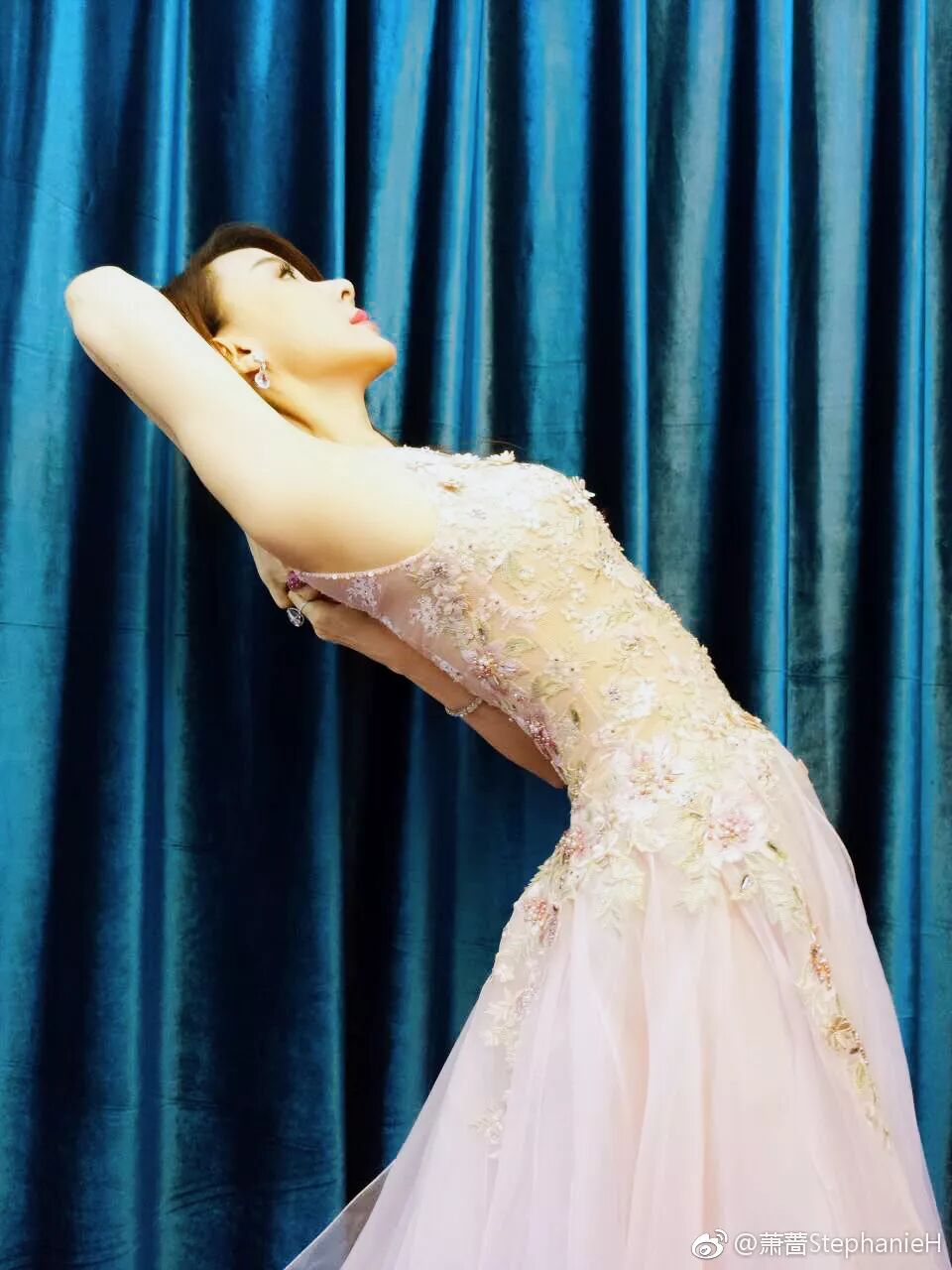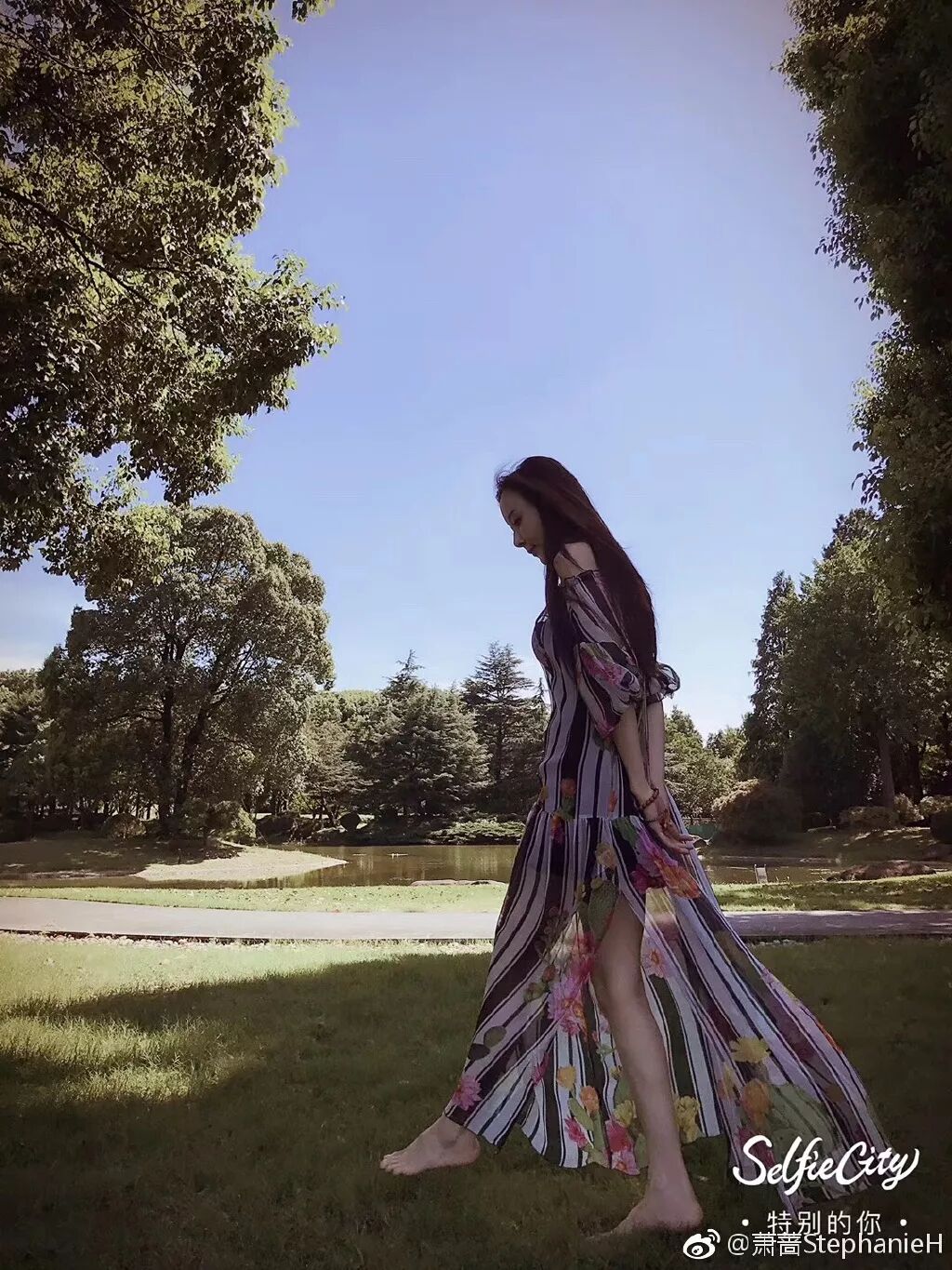 照片中萧蔷一件白色露腰上衣、紫色A字短裙