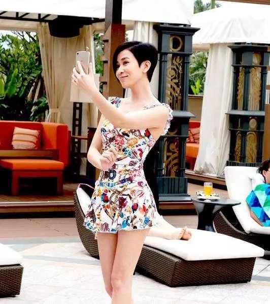 这次镜头一转回到澳门,于泳池畔拍摄,以泳装上阵的阿佘担心露出伤痕,就以比较密实的裙摆设计泳装示人,晒长腿!