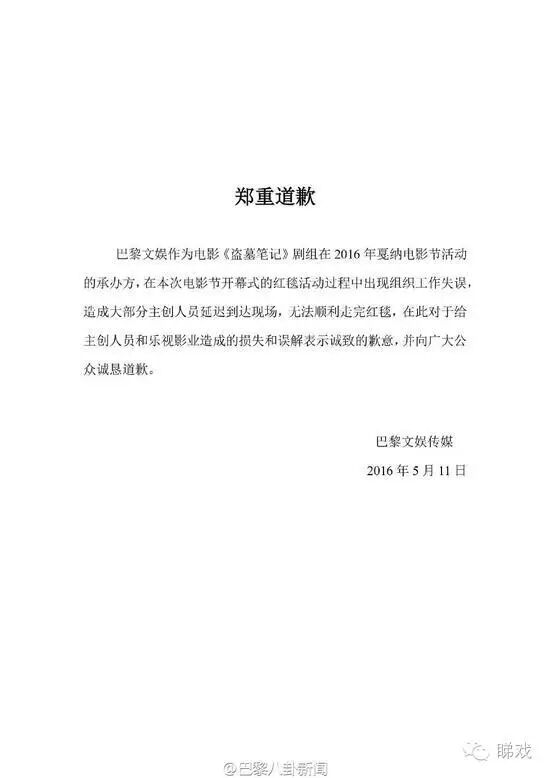 最后整个事件以巴黎文娱的一封致歉声明结束