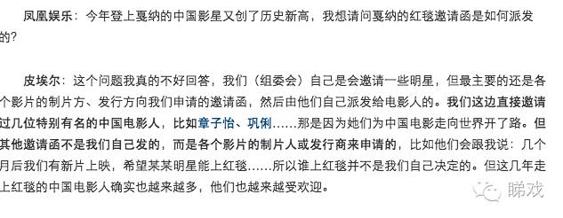 有媒体去年专访戛纳主席皮埃尔的时候,主席就已经明确的告诉了我们“中国女性红毯邀请函基本不上我们发的”