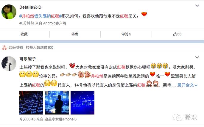 但睇妹看了下微博言论,面对井柏然错失戛纳红毯的话题,网友表示“我喜欢他跟他走不走红毯无关”,据网友透露14号井宝还将以代言人身份踏上戛纳红毯……