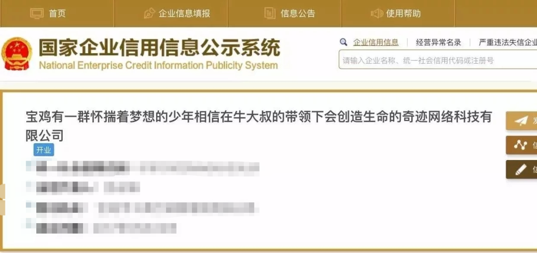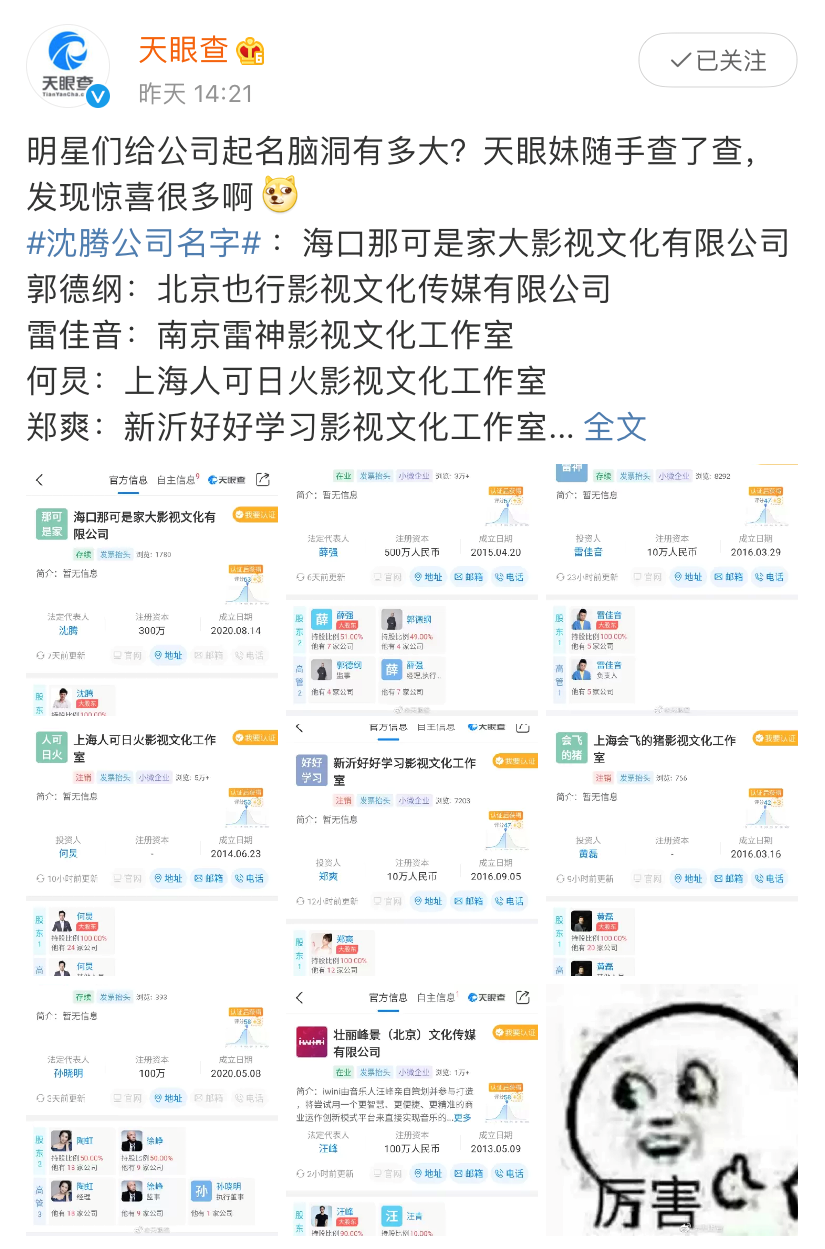 沈腾公司名火了,炸出一堆取名鬼才 lns优选 内地男星 2020-09-06 22:30:27 518 创作不易,用心坚持,欢迎请BaGua喝几杯爱心咖啡!打赏并支持本文 打赏并删除本文 广告女王(ID:adqueen)授权转载这几天戳中社长笑点的事情可太多了吧!先有岳云鹏代言老乡鸡,鸡不可失失不再来。又有沈腾公司名字一举冲上热搜:社长我心里就纳了闷了,起个名字能有这么大排面,一举就是热搜第一?点进去一看,破案了,哈哈哈哈哈哈这名字叫:海口那可是家大广告公司 好家伙,为什么沈腾可以用语音注册公司名,难道这就是西虹市首富的实力?隔着屏幕我都能脑补出沈叔叔的语气、表情和动作,一拍手一跺脚小眉头一皱,“海口那可是家大广告公司啊,这你都不知道???”有网友还特地脑补了这家公司员工的对话,是马冬梅内味儿了:还科普了名字的来源:键盘撒米,鸡瞎琢...磨的反正社长看了这个名字,脑海中只有四个字:夸下海口!BUT上热搜的是沈腾没上的还有何炅、黄磊、林更新...我怀疑明星取名字是流水线作业,要不怎么会一个比一个好笑, 一个比一个有意思。何炅:上海人可日火影视文化工作室郑爽:新沂好好学习影视文化工作室黄磊:上海会飞的猪影视文化工作室徐峥:海南省洋洋得意文化传播有限公司汪峰:壮丽峰景(北京)文化传媒有限公司郭德纲:北京也行影视文化传媒有限公司雷佳音:南京雷神影视文化工作室林更新:新沂久亿梦影视文化工作室大张伟:北京开心伟业文化有限公司大张伟:上海来劲文化传播工作室黄景瑜:在京之鱼影视文化传媒有限公司恕我直言,虽然我知道何老师的人可日火是何炅汉字拆解,但是就还是想问一句:好端端的为什么要去日火影啊?这波脑洞大开的公司名,除了炸出明星,还炸出了网友的白日梦,谁还不是个起名鬼才了呢?社长我还努力去扒了一下,还有这些:北京怕老婆科技有限公司▼云南妈妈说名字太长不容易被别人记住网络科技有限公司▼深圳市赚他一个亿实业有限公司▼宝鸡有一群怀揣着梦想的少年相信在牛大叔的带领下会创造生命的奇迹网络科技有限公司▼卧槽科技(深圳)有限公司▼有一说一,要是广告人起标题也能跟取公司名字一样,脑洞这么大就好了!同时,社长我的敏感度,肯定会抓到和广告相关的点点滴滴,比如就从热搜上抓到了一个暗戳戳打广告的天眼查:要不说蹭热点要蹭出新姿势,才能火。天眼查就另辟蹊径,不说沈腾是个取名鬼才,而是转向明星取公司名脑洞有多大,凭借查出来的公司名吸引了一大波粉丝关注,还给自己的天眼查打一波广告,这一天我估计是天眼查网站流量巅峰了吧,一波操作双赢啊。而且这件事还告诉了我们一个道理:蹭热点一定要快比如企查查晚了俩小时吧,热度都给天眼查抢了去了,要用1400+的会员才能换的回来,没有内涵的意思哈。最后社长要是有公司,就想要取一个响亮又好听的名字:不工作室!今天要跟大家介绍下小IN每天会分享INS新资讯长按添加订阅Share the World's MomentsInstaChina▼ 创作不易,用心坚持,欢迎请BaGua喝几杯爱心咖啡!打赏并支持本文 打赏并删除本文 感谢您的支持鼓励,我会继续努力的!文章地址:用户邮箱:打赏金额:USDT 请输入数字点击”去打赏“,即可进行打赏支持本文章哦 沈腾 About the Author lns优选 功能介绍:更多有趣有价值的资讯分享,带你发现更酷的世界。 Related Posts 郭晶晶秀恩爱意外暴露顶级珠宝:她的节俭,装了多少年..... 2023-06-08 23:29:18 43岁张静初“被联合封杀”十几年,住豪宅、当富婆、考研上岸:封杀我?搞笑 2023-04-13 22:41:04 韩顶流影后好惨!亲妈行骗13亿她帮还债,倾家荡产住破屋? 2022-04-07 22:41:09 林志炫因“哥哥”人设崩塌?看完他的2500㎡私宅,网友:我们错怪他了 2021-09-19 22:40:31 布兰妮订婚了!千万粉丝却公开抗议:快离开骗钱的渣男! 2021-09-14 23:03:08 发表评论